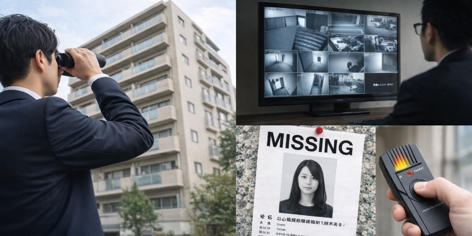 浮気調査/金銭トラブル/人探し/ストーカー対策/盗聴器発見/いじめ実態調査 など