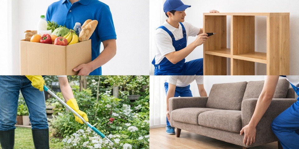 買い物代行/店舗お手伝い(飲食店ホール・洗い場・留守番等)/各種代理代行/家具組み立て/家具家電の移動/不要品処分/遺品整理/各種清掃/庭掃除/鍵の交換